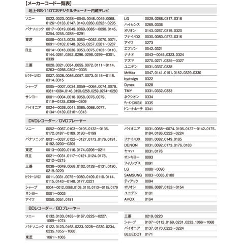 ソニー、パナソニック、東芝、日立、三菱、ビクター(JVC)、シャープ、サンヨー、パイオニア、LG、ハイセンス、オリオン、フナイ/DX、アイワ、エプソン、ナナオ、アズマ、ユニデン、MrMax、byd:sign、Dynex、TMY、ネクシオン、ディーオン(CANDELA)、ドン・キホーテ