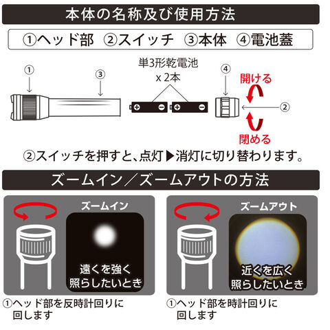 ※新品アルカリ乾電池使用時の目安です。実際の点灯時間は電池残量、電池の種類、ご使用環境・状況などによって異なります。 - サイズ(約):最大径27×長さ148mm