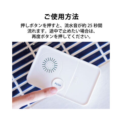 押しボタンを押すと流水音が約25秒間流れ、トイレの用足し音を消します。
