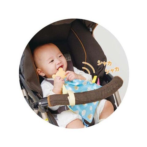 ●リラックマの歯固めがひょっこり覗いた、しゃかしゃか音が鳴るタオルです。