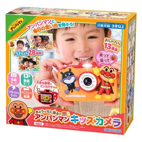 おでかけがより楽しくなる、はじめてのこども向けカメラです。 シリコン素材のカバーが付いており、手なじみが良く、またストラップが付いているため、首にかけて持ち運びができます。 アンパンマンのおしゃべり13種入り! 遊びを盛り上げます。 写真撮影は最大8倍のズーム、イン・アウトカメラ切替、フラッシュライトなど様々な機能が付いています。 28種のアンパンマンデザインフレームを使って写真撮影が楽しめます。 動画撮影はイン・アウトカメラ切替やスロー撮影、こま撮りなど様々な撮影が楽しめます。 付属のケーブルを使って、撮った写真、動画をパソコンに転送することができます。 子どもの撮った写真を見ることで、子どもの視点を知ることができ、親子のコミュニケーション活性につながります。 電池:リチウムイオン電池内蔵