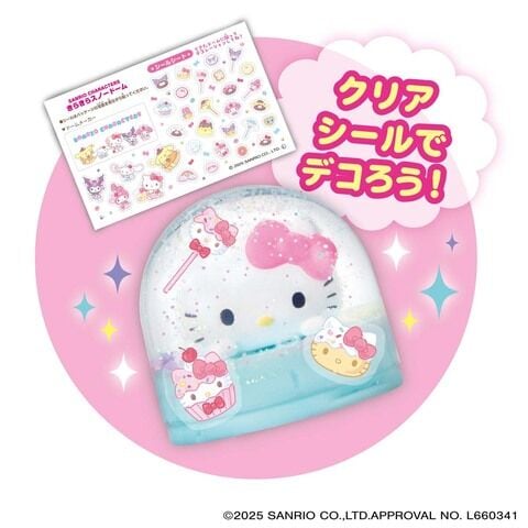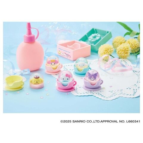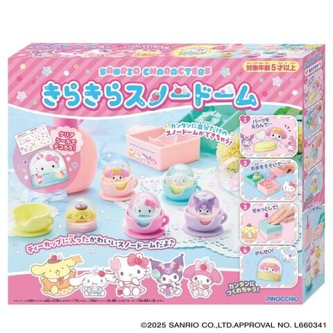 小さなスノードームが作れる「きらきらスノードーム」がサンリオキャラクターズデザインで新登場! 人形とベースプレートの組み合わせを選び、デコチャームを入れて、ドームに水とタブレットを入れて圧入します。 出来上がったスノードームには、付属のシールでデコレーションができ、自分だけのスノードームがつくれます。 付属のティーカップに取り付けて、飾ることができます。