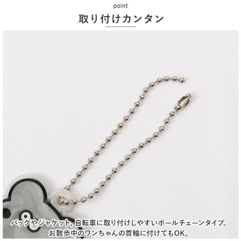 バッグやジャケット、自転車に取り付けしやすいボールチェーンタイプ。お散歩中のワンちゃんの首輪に付けてもOK。