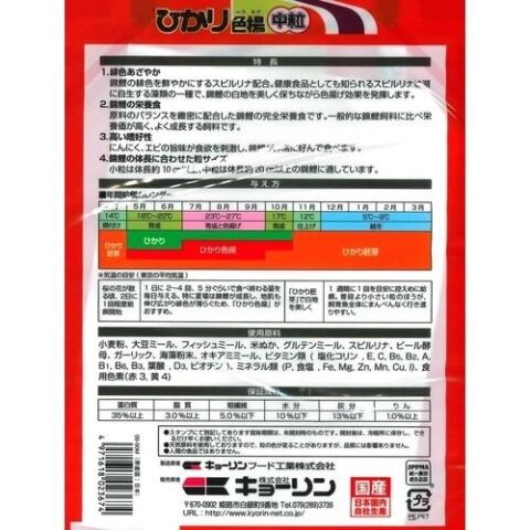 ■使用原料:小麦粉、大豆ミール、フィッシュミール、米ぬか、グルテンミール、ビール酵母、スピルリナ、魚油、ガーリック、海藻粉末、オキアミミール、ビタミン類(塩化コリンECB5B2AB1B6B3葉酸D3ビオチン)、ミネラル類(PNaClFeMgZnMnCuI)、食用色素(赤3黄4)