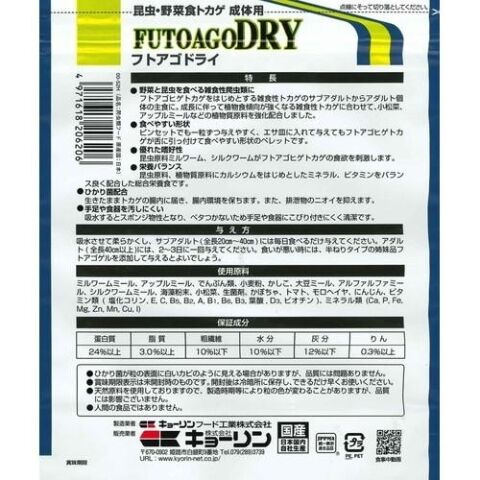 ■使用原料:ミルワームミール、アップルミール、でんぷん類、小麦粉、かしこ、大豆ミール、アルファルファミール、シルクワームミール、海藻粉末、小松菜、生菌剤、かぼちゃ、トマト、モロヘイヤ、にんじん、ビタミン類(塩化コリンECB5B2AB1B6B3葉酸D3ビオチン)、ミネラル類(CaPFeMgZnMnCuI)
