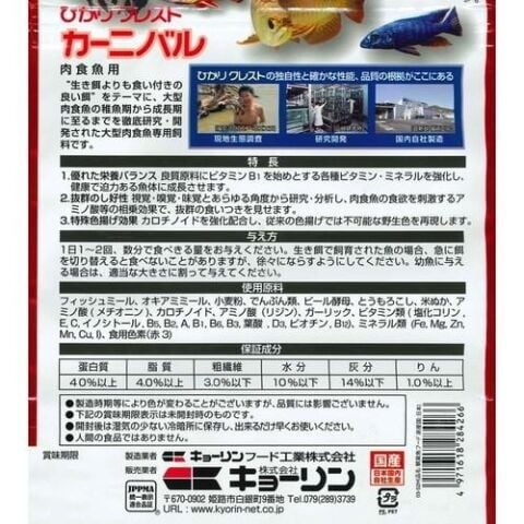 ■使用原料:フィッシュミール、オキアミミール、小麦粉、でんぷん類、ビール酵母、とうもろこし、米ぬか、アミノ酸(メチオニン)、カロチノイド、アミノ酸(リジン)、ガーリック 、ビタミン類(塩化コリンECイノシトールB5B2AB1B6B3葉酸D3ビオチンB12)、ミネラル類(FeMgZnMnCuI)、食用色素(赤3)