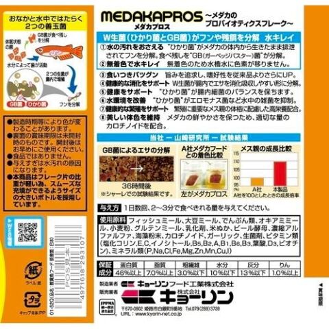 ■使用原料:フィッシュミール、大豆ミール、でんぷん類、オキアミミール、小麦粉、グルテンミール、乳化剤、米ぬか、ビール酵母、濃縮アルファルファ、海藻粉末、カロチノイド、ガーリック、生菌剤、ビタミン類(塩化コリンECイノシトールB5B2AB1B6B3葉酸D3ビオチン)、ミネラル類(PNaClFeMgZnMnCuI)