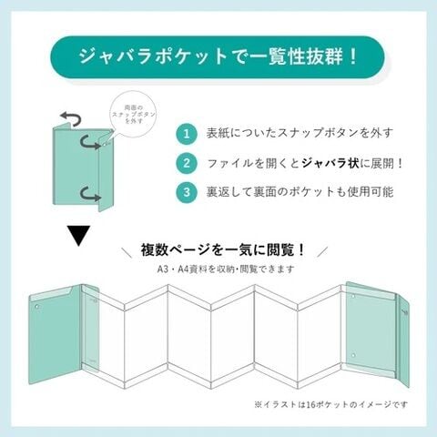 ポケットがジャバラ状につながったクリアーファイルです。展開するとジャバラ状に開き、複数ページを同時に閲覧できます。
