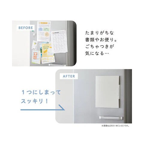 「冷蔵庫ピタッとファイル(書類整理タイプ)」は、つい冷蔵庫に貼りがちなプリントやおたよりなど、異なるサイズの書類をひとまとめに収納し、表紙を閉じて隠すことができるファイルです。