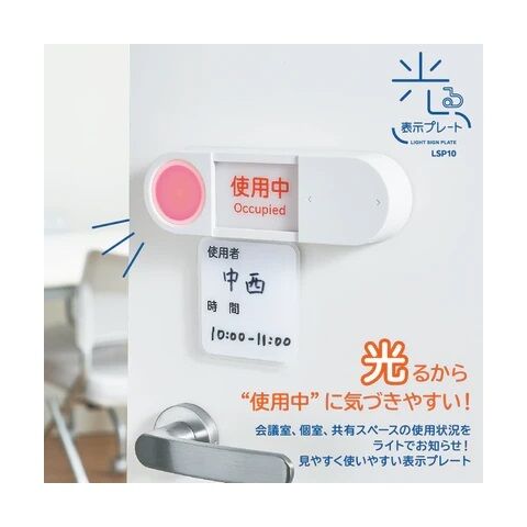 ◆光るから 使用中″に気づきやすい。会議室、個室、共有スペースの使用状況をライトで知らせる表示プレートです。