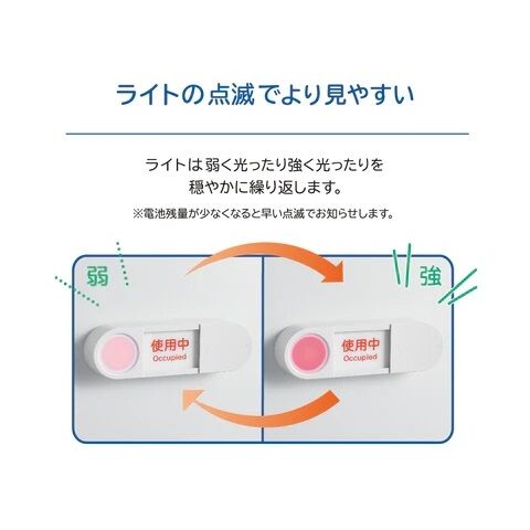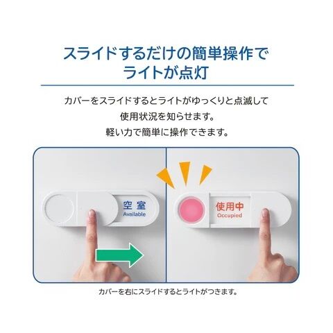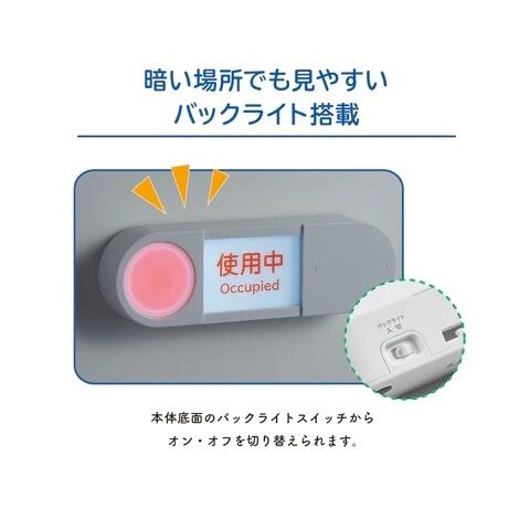 カバーをスライドすると赤いライトがゆっくりと点滅して、遠くからでも会議室や共有スペースの使用状況を確認できます。表示部分はバックライト搭載で暗い場所でもはっきりと文字を認識できます。