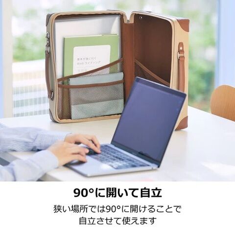 開くとフラットになるため、そのまま机の棚に入れて引き出しのように使えます。また90度に開いて自立させれば、カフェや図書館など狭いスペースでも場所を取らず、収納物を取り出すのも簡単です。