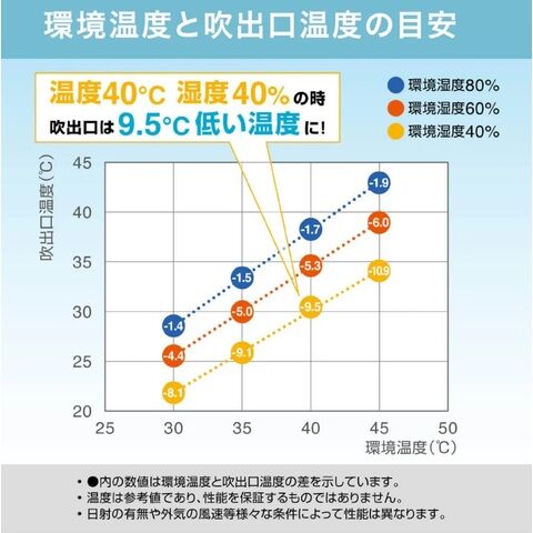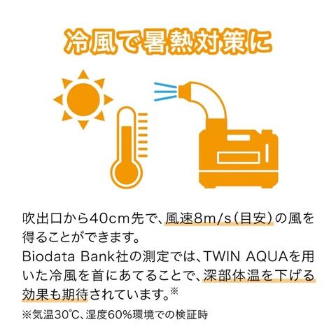 吹出口から40cm先で、風速8m/s(目安)の冷風を得ることができます。Biodata Bank社での測定では、TwinAquaを用いた冷風を首にあてることで、深部体温を下げる効果も期待されています。※