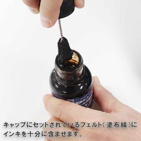 ・キャップにセットされているフェルト(塗布綿)にインキを十分に含ませムラなく均一に塗ってください。