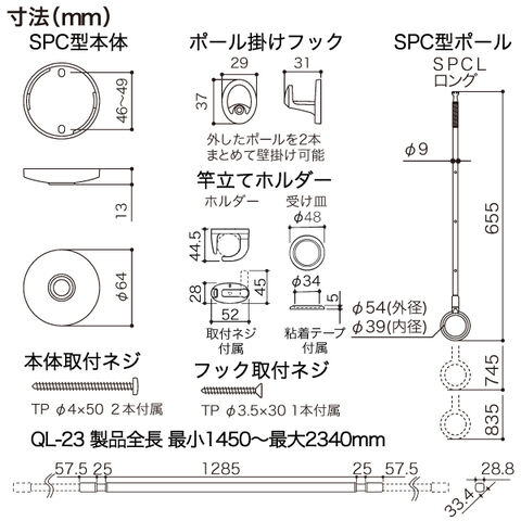 QL-23-BK - 全長(約):最小1450~最大2340mm