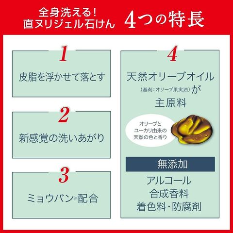 ■成分:水、オリーブ果実油、オリーブ油脂肪酸、水酸化K、ユーカリ葉油、アルムK、オリーブ葉エキス、ヒマワリ種子油、トコフェロール
