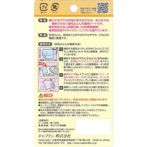 ◆プルーフ加工が施されており、羽毛ふとん、羽毛まくらの破れ・カギザキ、穴アキの補修に最適です。