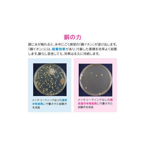 「銅イオン」には、殺菌効果があり、付着した菌類を効率よく殺菌します。酸化し変色しても、効果は永久に持続します。
