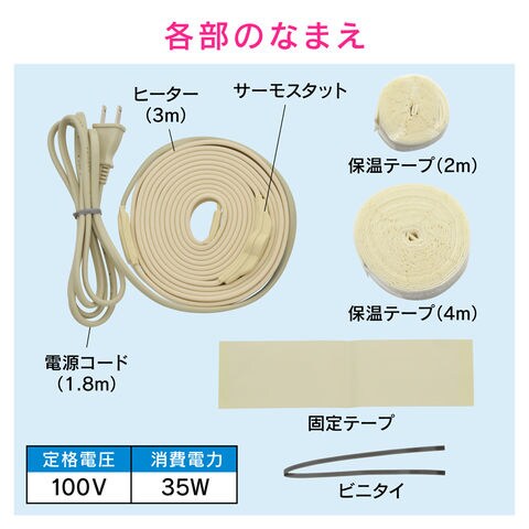 - 付属品:ビニタイ、固定テープ、保温テープ(2m、4m各1個)