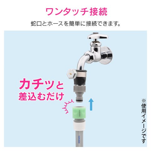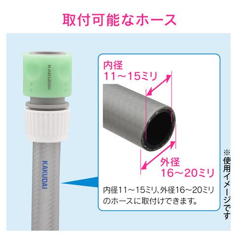◆ホーセンドは内径11~15ミリ、外径16~20ミリのホースに取付けでき、万能口金に差込むだけでワンタッチで接続できます。