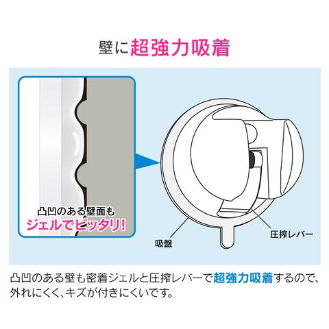 ◆強力密着ジェルで、これまでの吸盤では外れやすかった凹凸のある壁にもしっかり吸着します。
