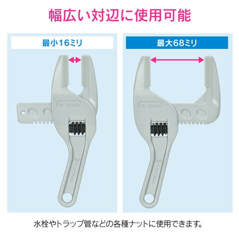 ◆レンチ幅が16~68ミリに調整できるので、幅広いサイズのナット部に使用できます。