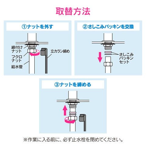 ◆トイレロータンクへの給水管や洗面器の立水栓に接続する給水管フクロナット部からの水もれを補修します。