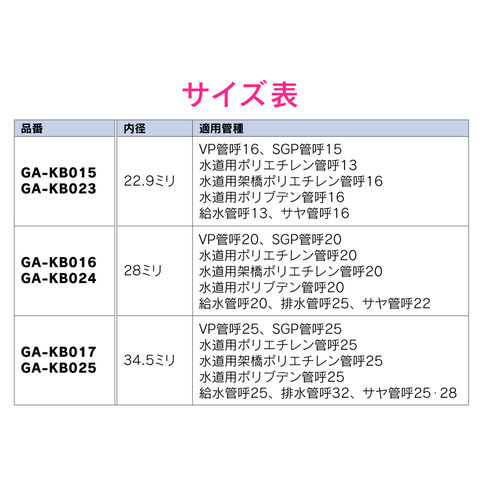◆呼13の給水管、水道用ポリエチレン管、呼16のVP管などに対応しています。