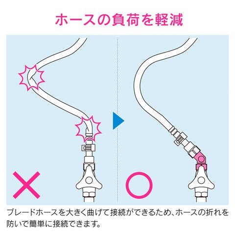 ◆止水栓から水栓金具までの距離が短く、給水・給湯ホースを施工し難い場合でも、45°にすることでホースの折れを防ぎ接続しやすくなります。
