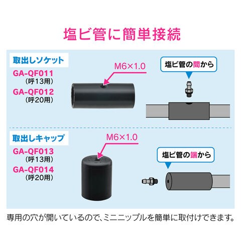 ◆別売の取出しソケット(GA-QF011・GA-QF012)や取出しキャップ(GA-QF013・GA-QF014)と組合わせることで、塩ビ管とマカロニホースを簡単に接続できます。