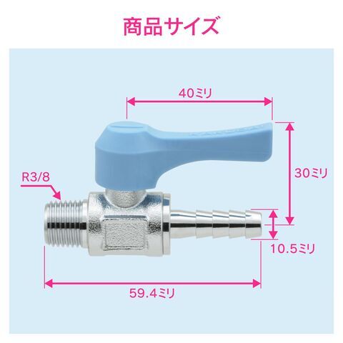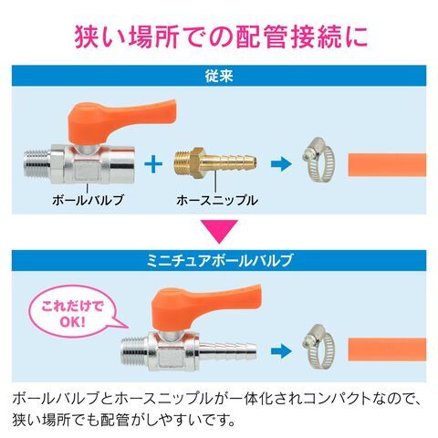 ◆ボールバルブとホースニップルが一体になっているので、ホースとエア機器などを直接接続することができます。