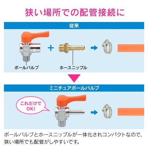 ◆ボールバルブとホースニップルが一体になっているので、ホースとエアー機器などを直接接続することができます。