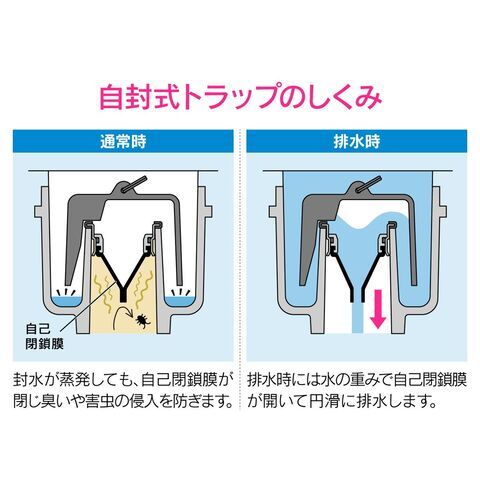 ◆長期間水を流さない排水口の防虫、防臭対策に最適な自封式トラップです。