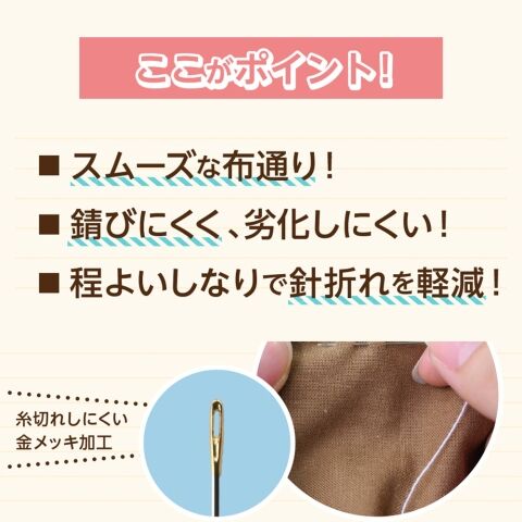 ◆針の頭は、柔らかい金属である金メッキ加工を施すことで、糸との接触がソフトになり糸切れを起こしにくくしています。