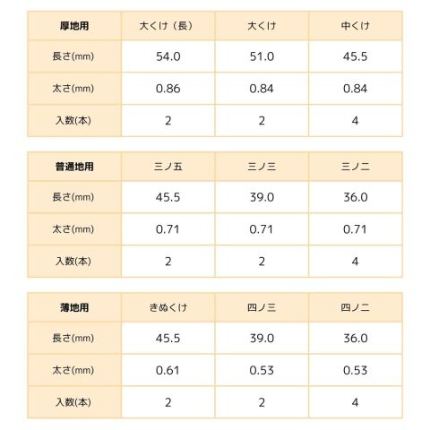 - 適した生地:薄地(薄手木綿・絹など)糸通し付き