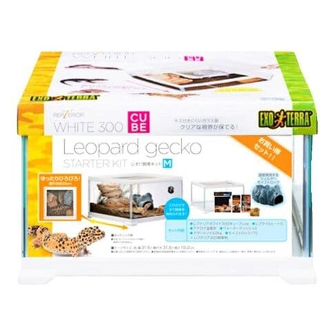 ◆飼育に必要な機能を盛り込んだコンパクトなガラス製ケージ、「レプテリアホワイト300CUBE Low」にシートヒーター、温度計、シェルター、水飲み皿、床材をセットしたすぐに飼育が始められるスターターキットです。