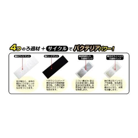 ◆ホワイトマット、ハードマット、活性炭入りろ過材パック、ゼオライト入りろ過材パックの4つのろ過材+生きたろ過バクテリア「サイクル」1回分が付いた上部フィルター用ろ過マットです。