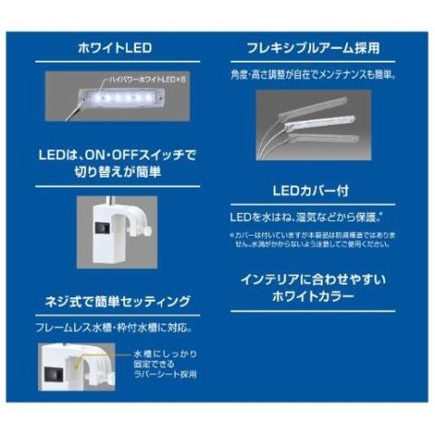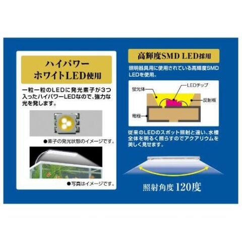◆照射角度120度で水槽をすみずみまで明るく照らす。魚や水草がきらめく白色光。