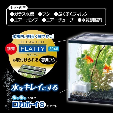 ■セット内容:ガラス水槽、アクアカバー(フタ)、ぶくぶくフィルター、エアーポンプ、エアーチューブ、水質調整剤