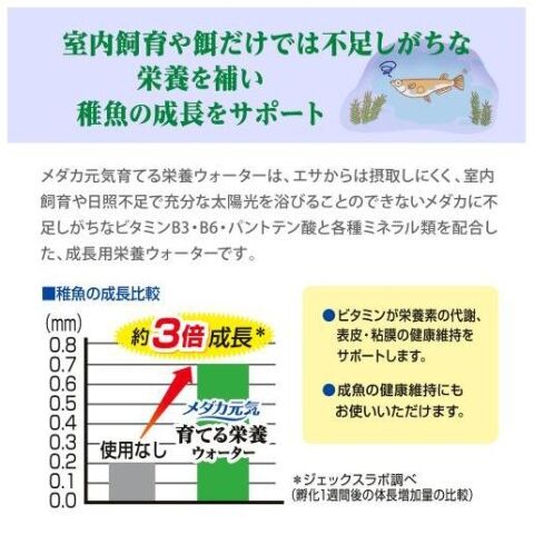 ◆餌から摂取しにくく、室内飼育や日照不足で充分な太陽光を浴びることのできないメダカに不足しがちなビタミンB3・B6・パントテン酸と各種ミネラル類を配合した、成長用栄養ウォーターです。