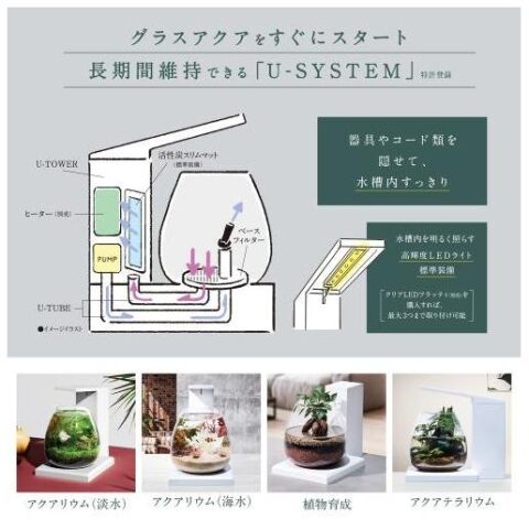 ◆長期間維持できる「U-SYSTEM(*特許登録)」採用で器具やコード類をすっきり隠せて、水槽内をすっきり。