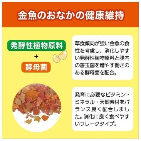 ◆草食傾向の強い金魚の食性を考慮し、消化しやすい発酵性植物原料と腸内の善玉菌を増やす働きのある酵母菌を配合。