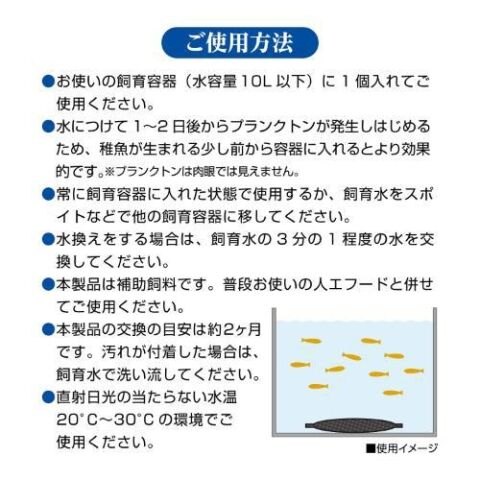 ◆本製品は飼育容器に入れておくだけで、孵化後1~2週間までの針子が食べられるブランクトンを発生させ、いつでも生きた餌をあげることができるので、針子をしっかりと育てることができます。