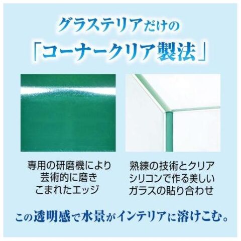 ◆コーナークリア製法で、ガラスの透明感で水景がインテリアに溶け込みます。