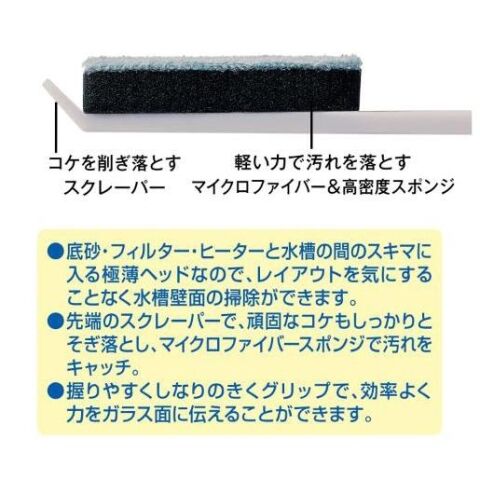 ◆底砂、フィルター・ヒーターと水槽の間のスキマに入る極薄ヘッドなので、レイアウトを気にすることなく水槽壁面の掃除ができます。
