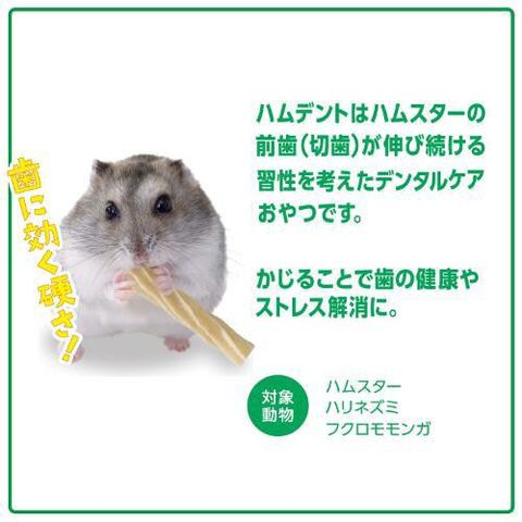 ◆ハムデントはハムスターの前歯(切歯)が伸び続ける習性を考えたデンタルケアおやつです。かじることで歯の健康やストレス解消に。
