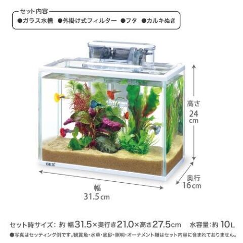 ■セット内容:ガラス水槽、外掛け式フィルター、フタ、カルキぬき