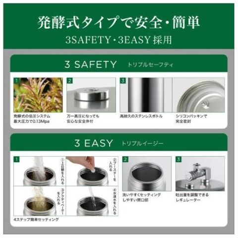 ◆万一高圧になった場合でも安心な高耐久ステンレスボトルと安全弁付なので、初めての方にも安心。