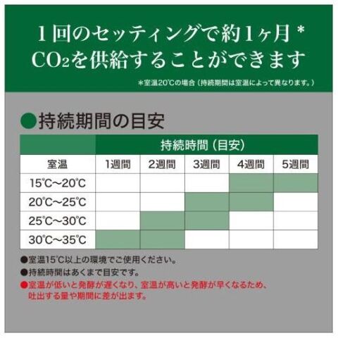 ◆1回のセッティングで約1ヶ月CO2を供給することができます。※室温20℃の場合(持続期間は室温によって異なります。)
