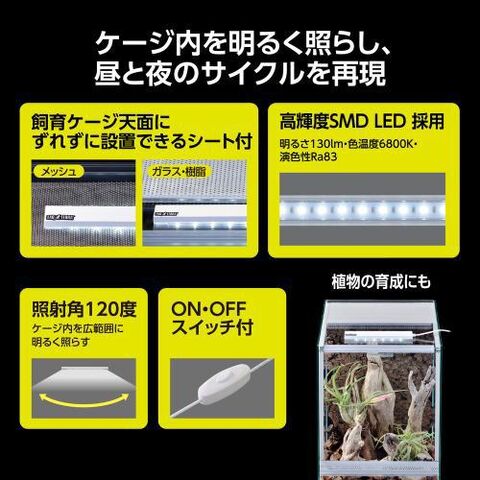 ケージ内を明るく照らし、昼と夜のサイクルを再現。